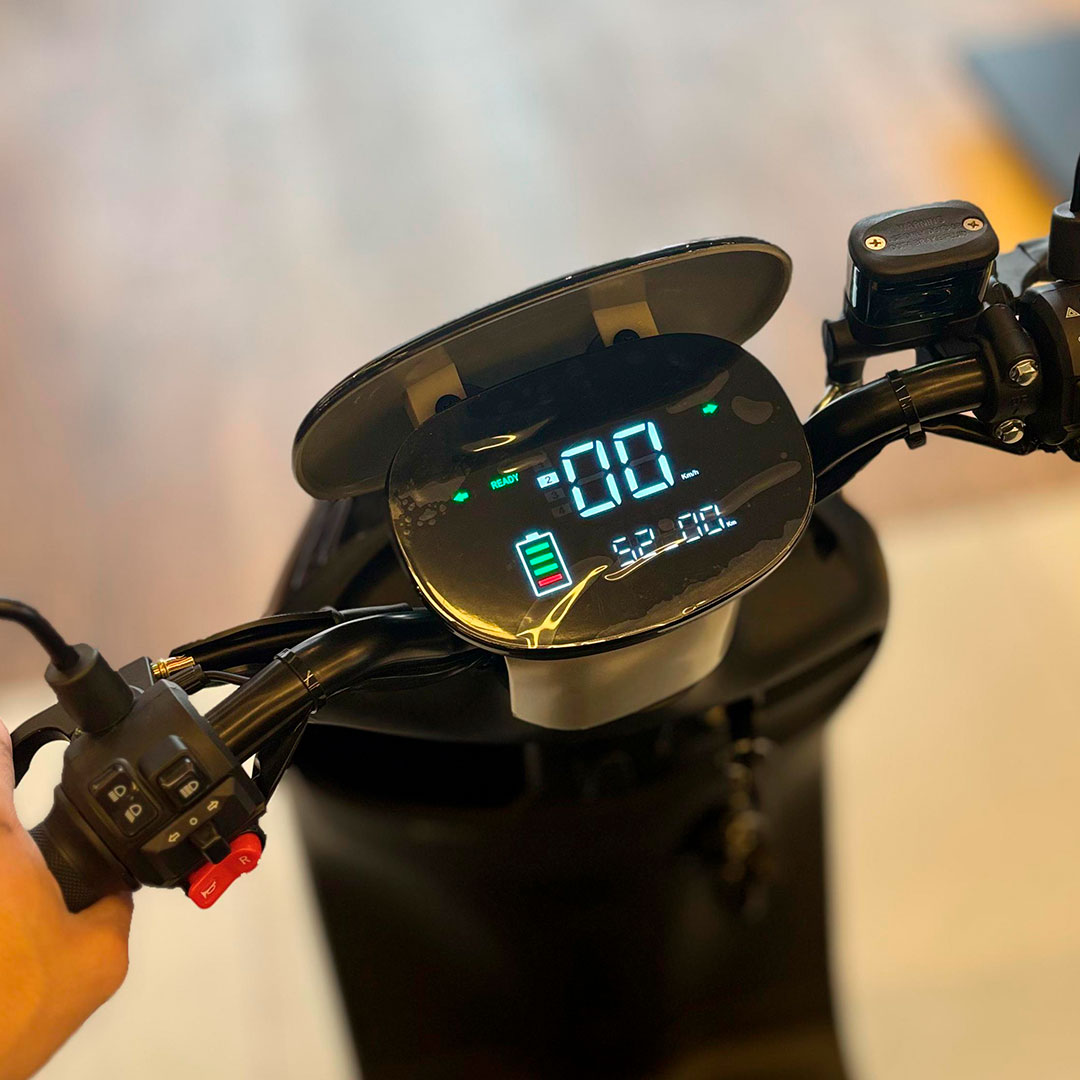 - Painel digital (velocidade/nível de bateria/odômetro/modo de condução)